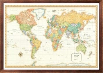 Framed Art Vintage World Map Print Brown Walnut Finish 24x36